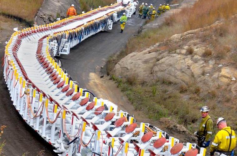 它的绰号是'shongololo',在苏佩脂的zulu字后,这并不难看出原因。在105米长,并且由超过一百个联合段组成,新的柔性输送机火车(FCT)看起来像在地下蠕动的巨大令人毛骨悚然,在旋转金属腿上慢慢推进。
