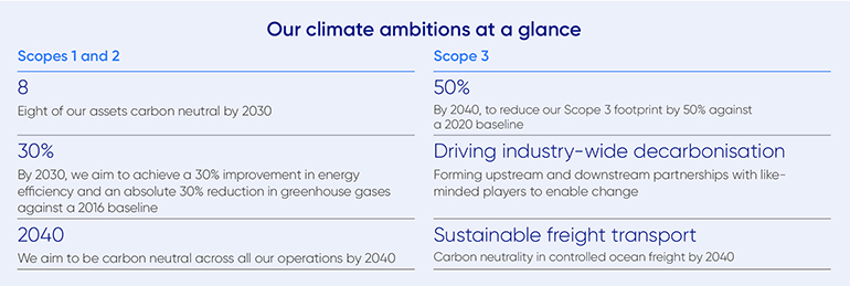 我们认识到我们有责任支持向低碳经济转型,并已经确定了到2040年实现我们在所有业务中实现碳中和的雄心壮志的途径。我们正在大幅减少能源消耗,转向低碳能源采购,并大幅提高可再生能源在能源结构中的作用。我们还将在我们管理的土地上实施基于自然的解决方案。